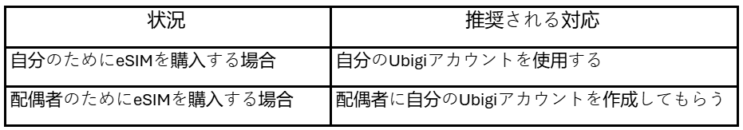 1つのeSIM = 1つのUbigiアカウント = 1つのデバイス